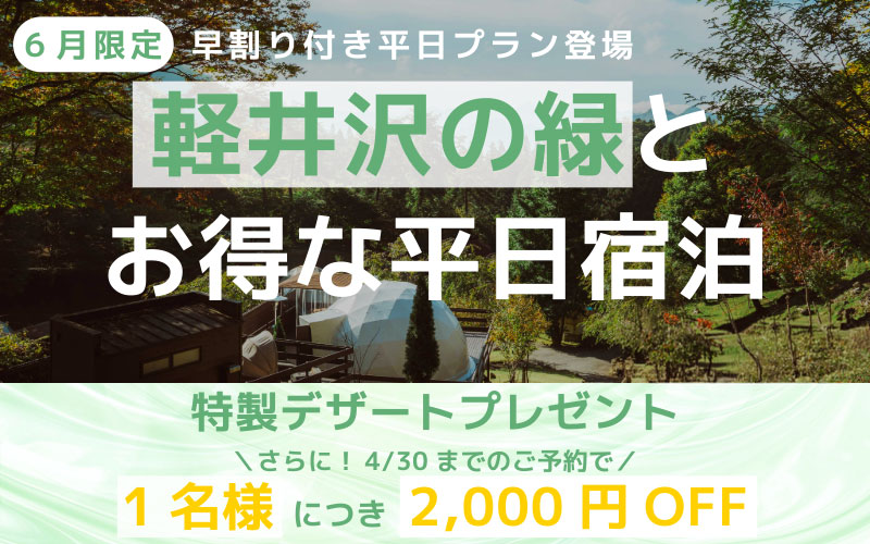 ※ 「特製デザートプレゼント」及び「4/30までのご予約でご宿泊料金お一人様2,000円OFF」は6月の平日にご宿泊いただく方が対象となります。(全テント対象)